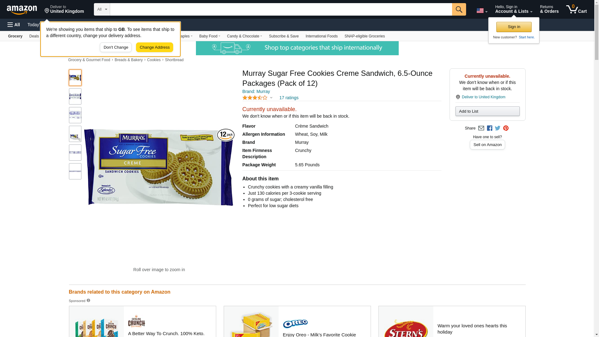 | Feature | Pack of twelve, 6.5-ounce packages of Murray Sugar Free Cr\xe8me Sandwich Cookies |