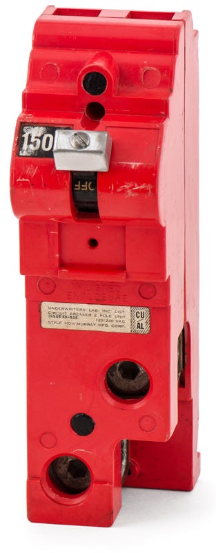 snippetMDH2150 - Murray Plug-On Molded Case Circuit Breaker Murray MD series double pole single phase 150 ampere plug-in molded case circuit breaker with maximum voltage rating of 240V tripping method thermal magnetic and standard interrupting rating of 22 kiloampere at 120V complete with non-interchangeable trip (LI) long-time and instantaneous trip functions and lug terminals