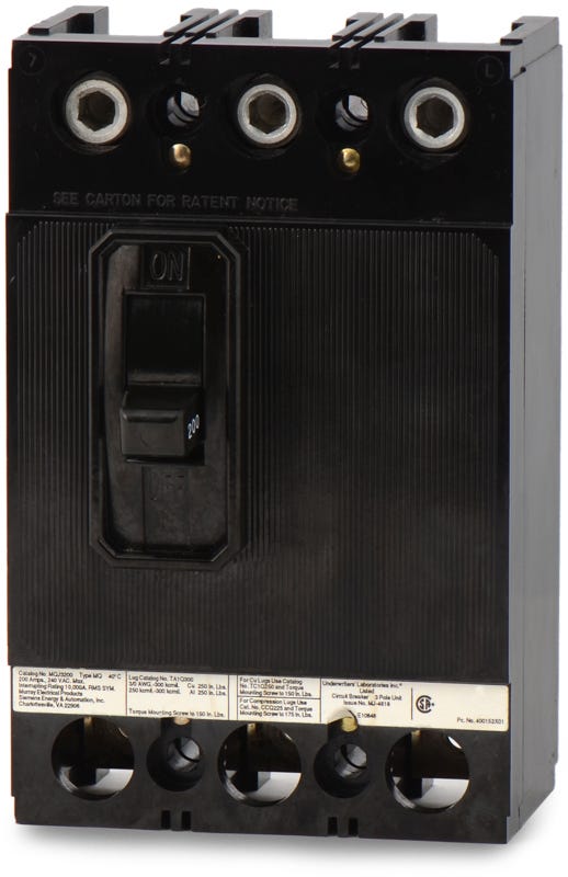 snippetMQJ3200 - Murray Bolt-On Circuit Breaker Murray MQJ series three pole 200 ampere bolt-on molded case circuit breaker with maximum voltage rating of 240V tripping method thermal magnetic and high interrupting rating of 10 kiloampere at 240V functions long-time and instantaneous.