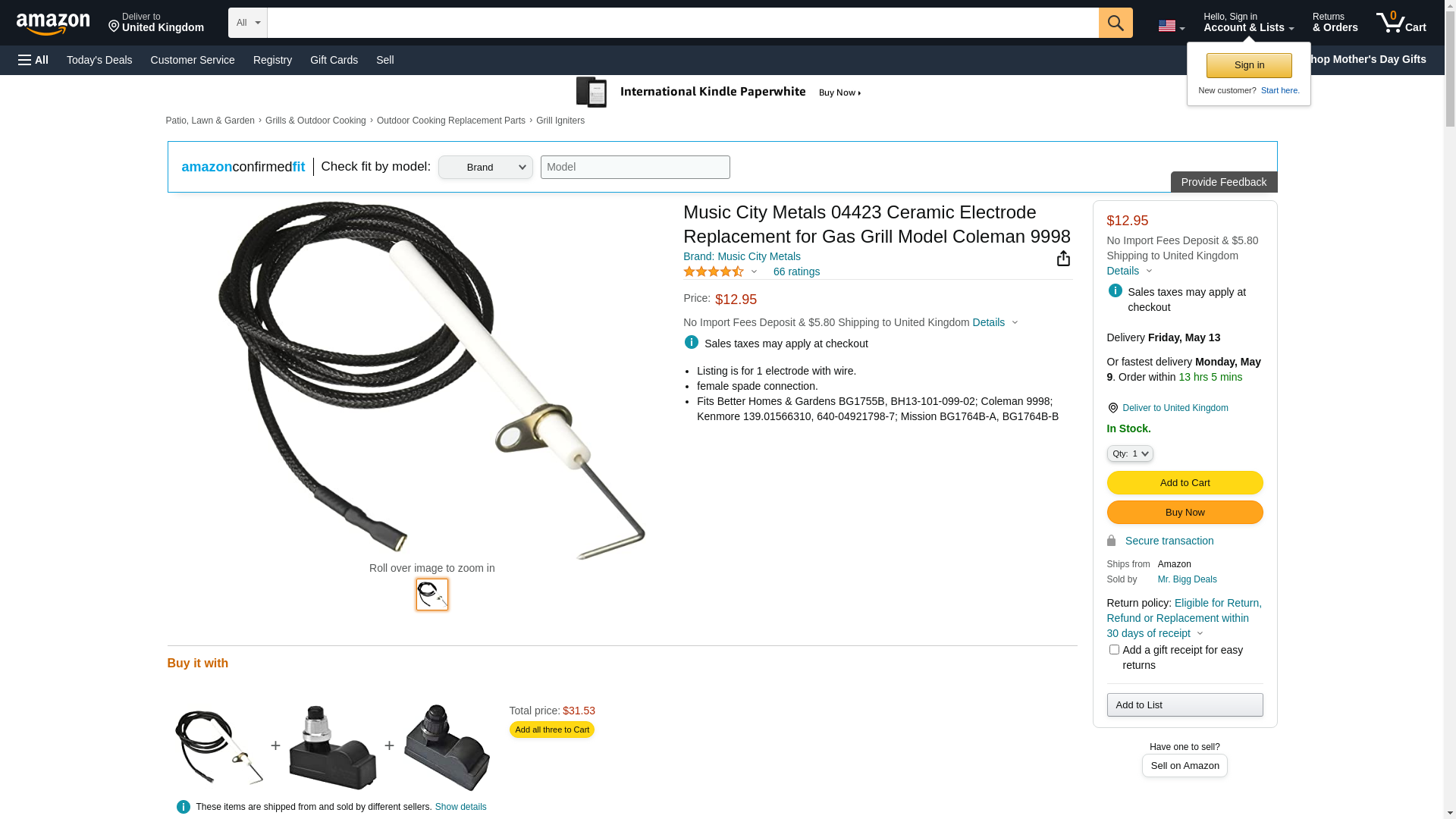 <div> Ceramic electrode for Gas Grill Models Coleman 9998 </div> <ul> <li>Listing is for 1 electrode with wire.</li> <li>female spade connection.</li> <li>Fits Better Homes & Gardens BG1755B, BH13-101-099-02; Coleman 9998; Kenmore 139.01566310, 640-04921798-7; Mission BG1764B-A, BG1764B-B</li> </ul>