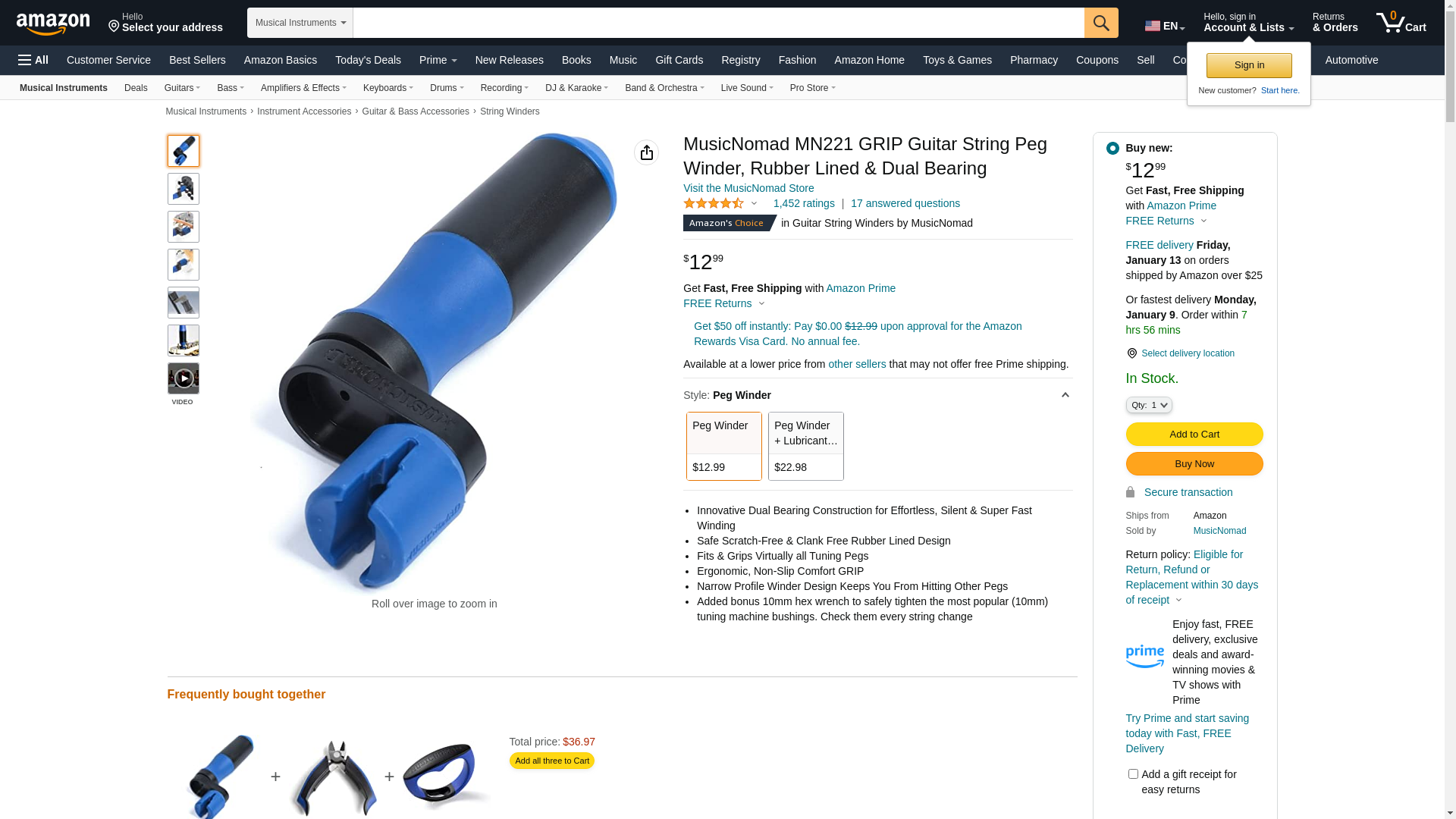 MusicNomad MN221 GRIP Guitar String Peg Winder, Rubber Lined & Dual Bearing
