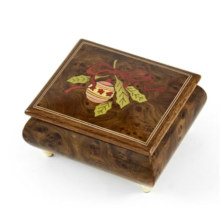 Tune: 18 note movement (please see above for available song titles)<br> Wood inlay: Christmas theme ornament with mistletoe and ribbon<br> Exterior: Various color stains w/ natural wood tone base<br> Interior: lined in plush brown fabric with open compartment<br> Wood/Materials: burl-walnut, gold hardware<br> Handcrafted in Sorrento, Italy<br> "4.25 L x 3.25"W x 2.25"H