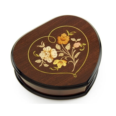 Elegant Wood Tone Heart Shaped Music Jewelry Box with Floral in Heart Frame Inlay Design - Over 400 Song Choices