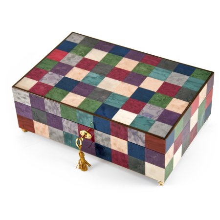 Gorgeous 18 Note Modern Pastel Checkered Sorrento Music Jewelry Box with Lock and Key - Yellow Ribbon - SWISS