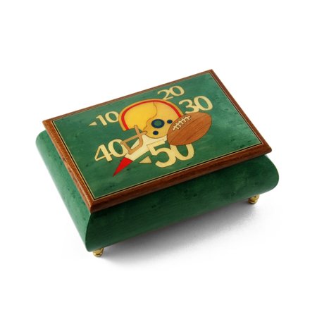 Handcrafted in Sorrento, Italy - highest quality wood and craftsmanship<br> 18 note movement (please see item options above for available tunes)<br> higher note movement available (please see higher note options in the above tab)<br> wood inlay: sports theme - Iconic football symbols such as helmet, football, flag, and yard markers<br> Green stain with variations of yellow & red accents with natural wood tone border<br> constructed of solid burl-elm<br> gold hardware