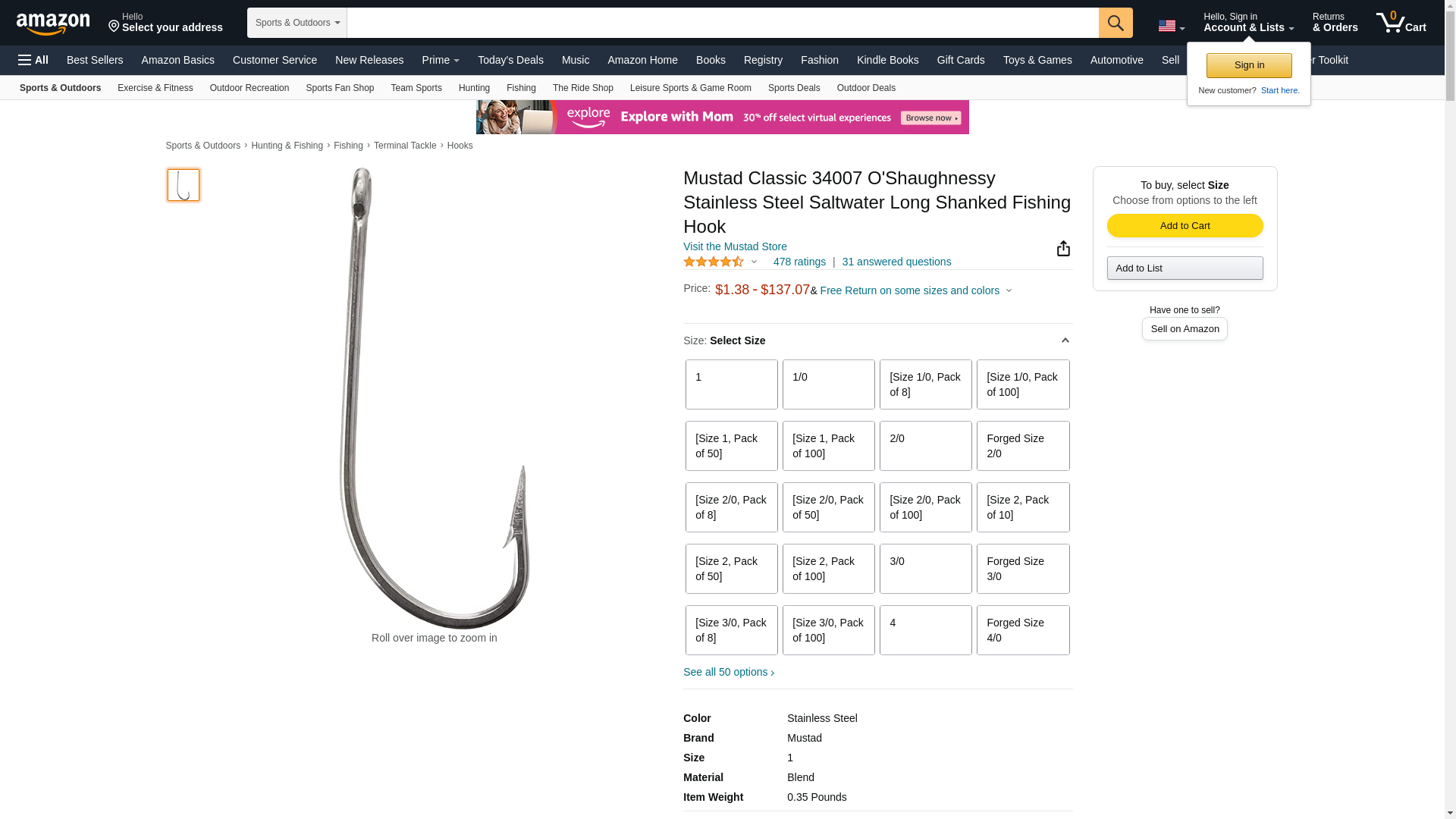 Mustad 34007-SS-1-100 Classic O'Shaughnessy Hook Size 1 Forged