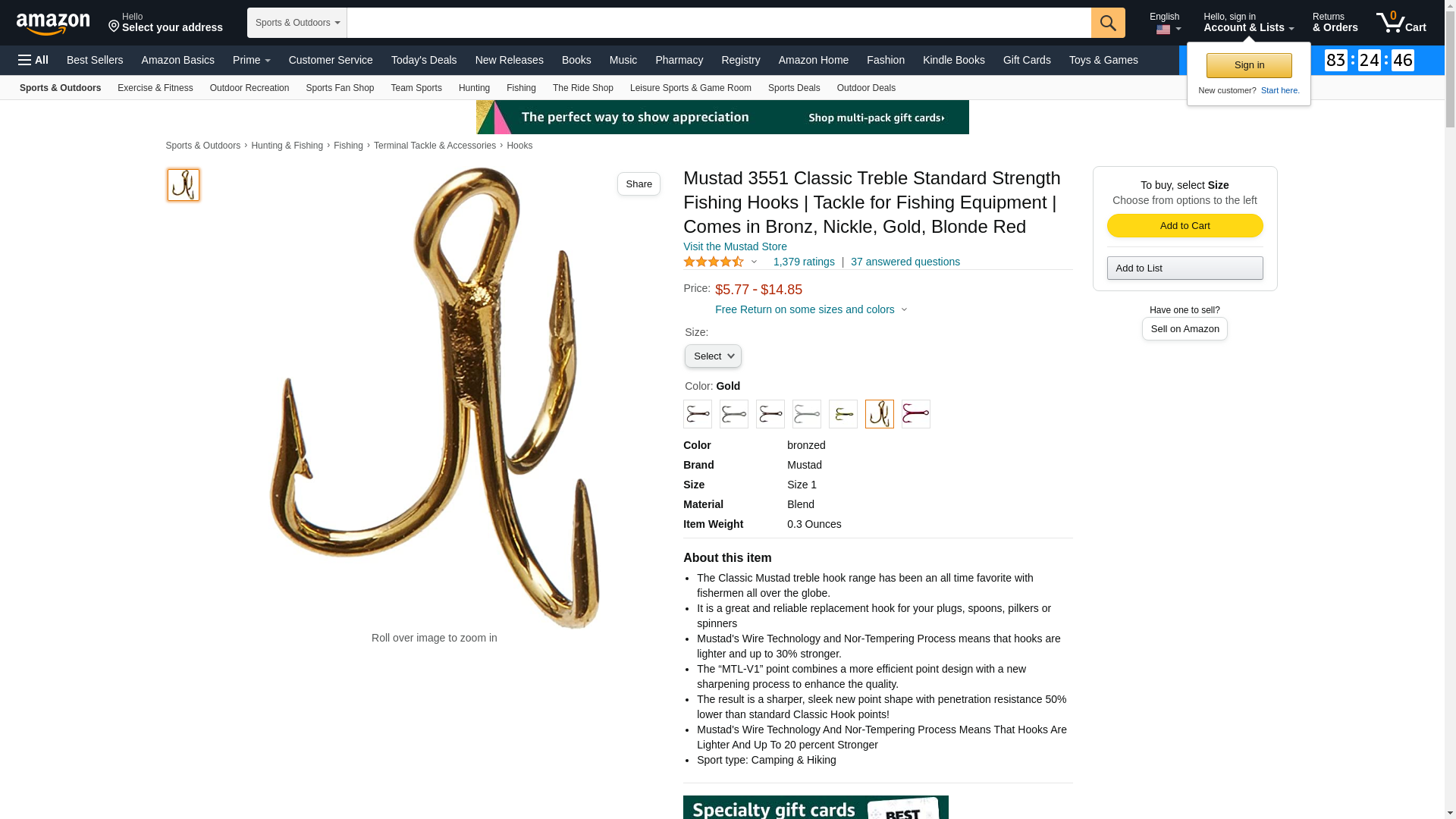 Mustad 35518 Classic Treble Standard Strength Hook (5-Pack), Gold, Size 18