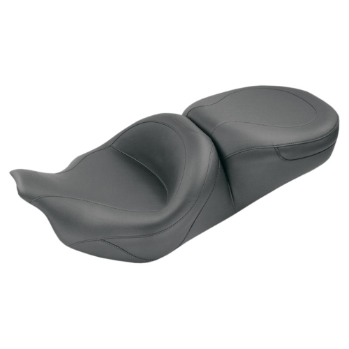 Perfect for average-sized riders who are comfortable with stock positioning but want a significant upgrade in comfort. The 17" wide front bucket is cut narrow at the nose so riders can easily plant their feet on the ground. A 14" wide rear seat offers support across its entire width for comfortable 2-up touring. Available plain or with studs, the baseplate is open in the middle to accept a stock HD or Mustang driver backrest kit. Fitment for HD Road King 08 to 19, Street Glide 08 to 19, Street Glide Trike 10 to 11, Electra Glide 08 to 19, Road Glide 08 to 19, Tri-Glide 09 to 19