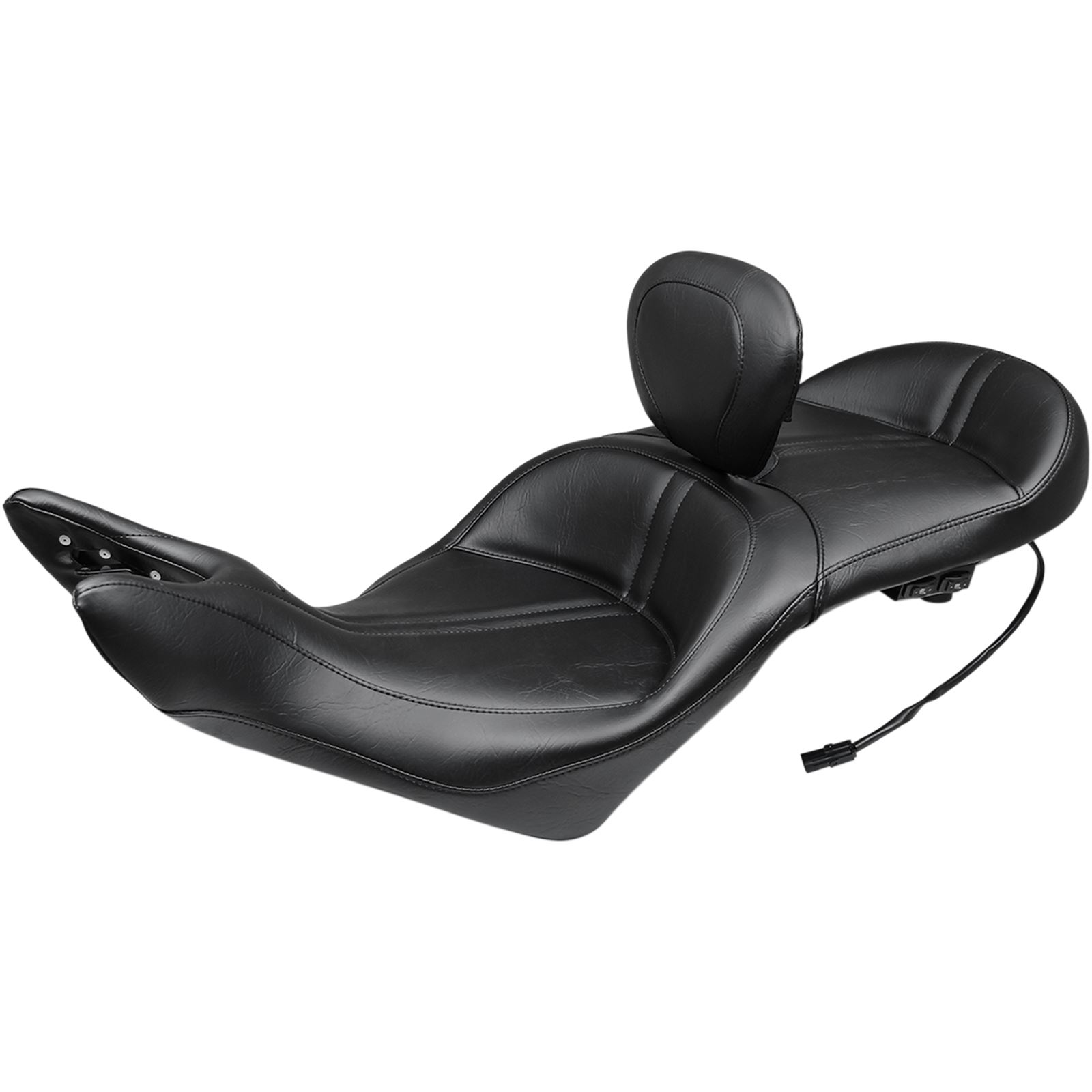 • Mustang offers significant improvements over the stock seat on Victory's luxury touring model• The new one-piece touring seat widened the bucket radius of both the front and rear seating areas, while also slightly lowering them• More comfortable design lets the driver sit back into the 17-1/2″ wide seat• Lower nose area also helps ensure that one's boots more securely reach the ground• Passenger is fully supported in a 15-1/2″ wide bucket that is contoured for comfort• Heating components for high/low dual control by the driver and passenger• Designed with detailed stitching accents to further enhance the Vision's striking lines• Perfectly matches the stock passenger backrest on the trunk• Driver backrest is easily removable, fully adjustable, folds for storage and quickly installs in the receiver which is built into Mustang's seat baseplate.