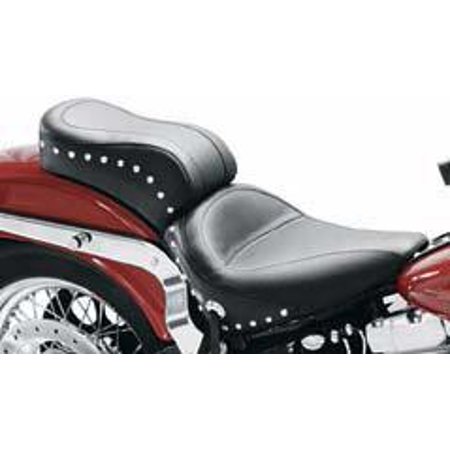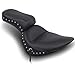 Features that make it our most popular seat A full front bucket for the rider, trimmed with a braided edge skirt that comes down over the frame and fender for a clean, uninterrupted look Passenger seat angles forward to support the rider&rsquos lower back Two-piece foam on a single piece, steel base that fits like stock Trimmed with the conchos tied with leather and chrome studs Naugahyde seat cover has sewn-in center panel Steel baseplates with carpet
