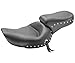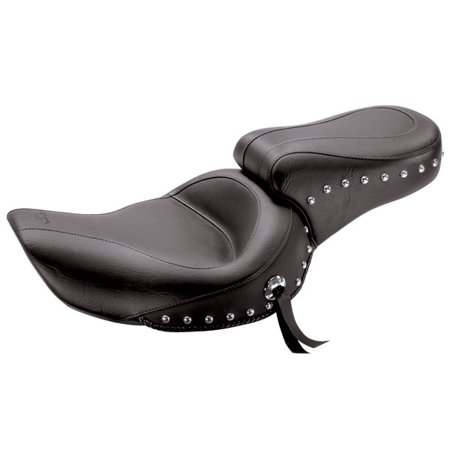• The Mustang skirted seat has all the features to make it our most popular seat• A full front bucket for the rider, trimmed with a braided edge skirt that comes down over the frame and fender for a clean, uninterrupted look• Passenger seat angles forward to support the rider's lower back• Two-piece foam on a single piece, steel base that fits like stock• Trimmed with the conchos tied with leather and chrome studs• Naugahyde seat cover has sewn-in center panel• Steel baseplates with carpet