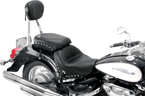Deeply contoured front bucketPassenger seat angles forward to support the rider's backPremium quality expanded vinyl coverBuilt in steel support wings in the passenger seatStudded style features studded skirt with conchos and a braid that extends below the edge of the seatTwo piece designNote: (070-75780 and 070-75960) Mustang seats will fit with Cobra brand Luggage Racks or Kawasaki Fire & Steel if rear seat tab is mounted on top of luggage rack.Note: (070-76510) Mustang Seats will not fit with Tour-Pak on Kingpin Tour models - Seats will not fit with a luggage rack on the 2012-2014 Vegas models.Note: (070-76550) Does not fit Venture models.Note: Image for reference only product may vary.
