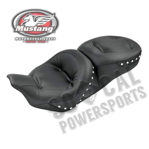 Fits: Harley Davidson FLHT/FLTR/FLHX/FLHR 2008-Up - Chrome StudsFor a luxurious ride try Mustang's One-Piece Regal Touring Seat with chrome studs. The plush touring design of this exceptional motorcycle seat provides unbelievable comfort. Tufted pillow styling is the key to ultimate comfort for rider and passenger alike. This touring seat comes with classic chrome studs. The driver's front bucket seat measures a full 17 inches wide and the passenger seat is 14 inches wide. The baseplate has slotting in the middle so either a stock Harley or Mustang driver backrest kit can be easily mounted. This custom one-piece motorcycle seat can be used with a handrail.