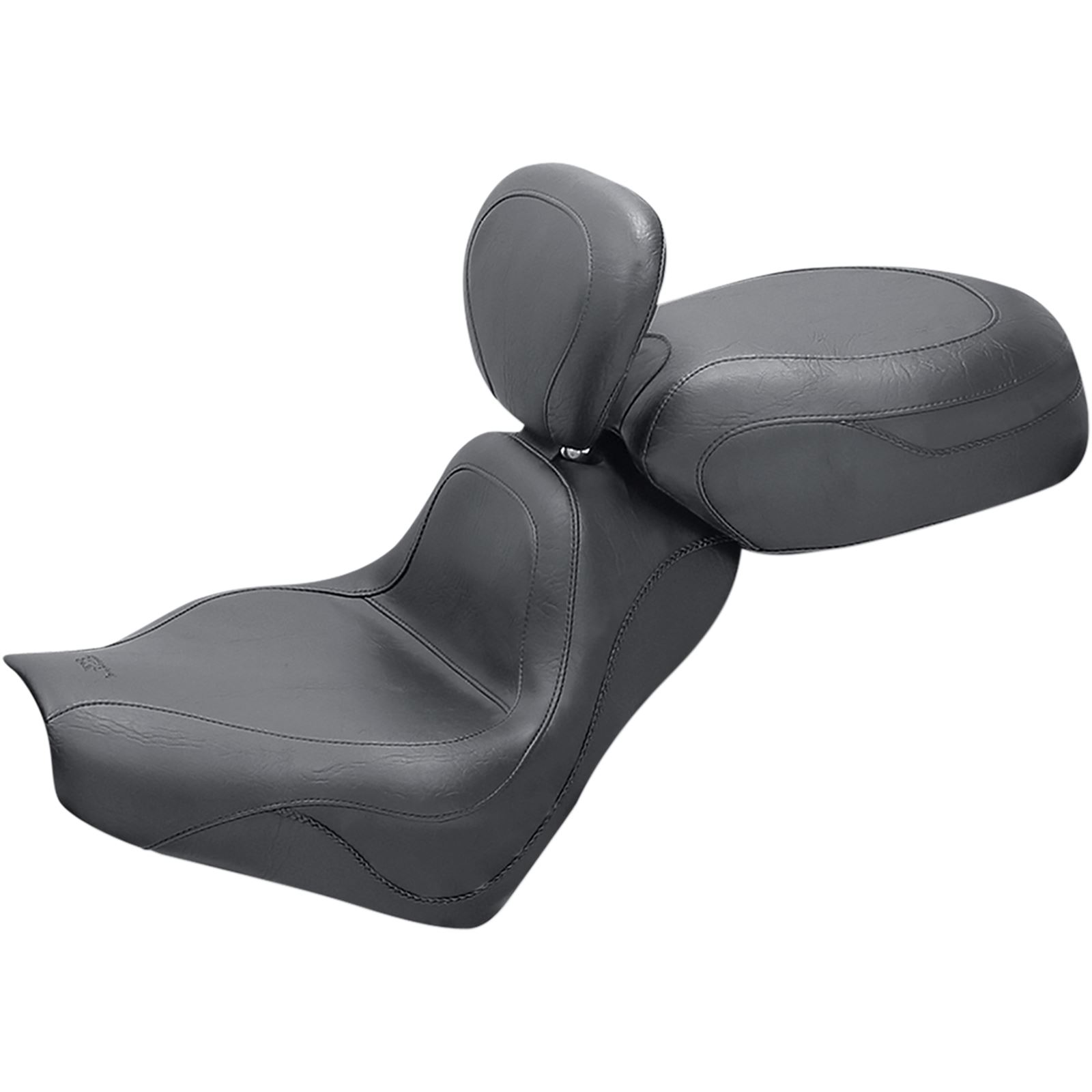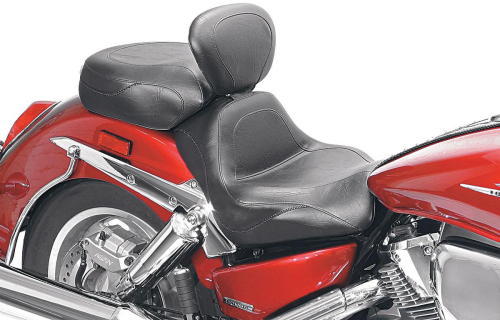 Fits: Honda VTX 1300 Retro/S/T 2002-2009 Sport Touring Two-Piece Vintage Seat with Driver Backrest, No StudsThe Two-Piece Vintage Sport Touring Seat has a deeply pocketed driver seat that positions you at the ideal cruising angle. The passenger sits comfortably in a 12.5 inches wide bucket that utilizes Mustang's unique internal steel support wings.Features skirt with braided edge trim. No studs. Front Width: 16 inches; Rear Width: 12.5 inches.