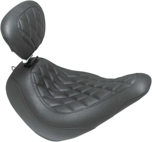 Seat Style: Diamond Stitch - Black<br><br>Mustang advanced comfort technology has been incorporated into this totally new style of seat.<br> Ride low, look cool and still be comfortable at the end of the day.<br> Choose from detailed diamond stitchwork or smooth seat.<br> Synthetic glove-leather cover.<br> Driver backrest is fully adjustable and easily removed.<br> Made in USA.<br> Front Width: 14in.