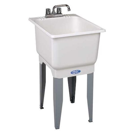 The MUSTEE 18 in. x 34 in. Plastic Laundry Tub features heavy gauge steel legs with adjustable levelers for sturdy use. The basin has a 15-gallon capacity and is leak proof. It also has an integrated drain and mildew-resistant surface that is easy to clean.