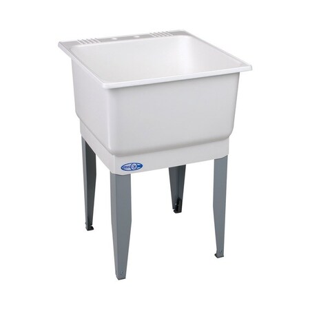 Mustee quality, features and performance have always set our Utilatub laundry or utility tubs apart from the rest no wonder why Mustee is the brand that is “Preferred by the Pros” and millions of homeowners alike.; ; Brand Name: Mustee Sub Brand: Utilatub Assembled Width: 23 in. Assembled Depth: 25 in. Sink Type: Single Material: Polypropylene Product Type: Laundry Tub Number of Faucet Holes: 2 Basin Depth: 13 in. Color: White Basin Capacity: 20 gal Packaging Type: Boxed Legs Included: Yes Number of Basins: 1 Faucet Included: No ADA Compliant: No Strainer Basket Included: Yes Assembled Height: 33 in.