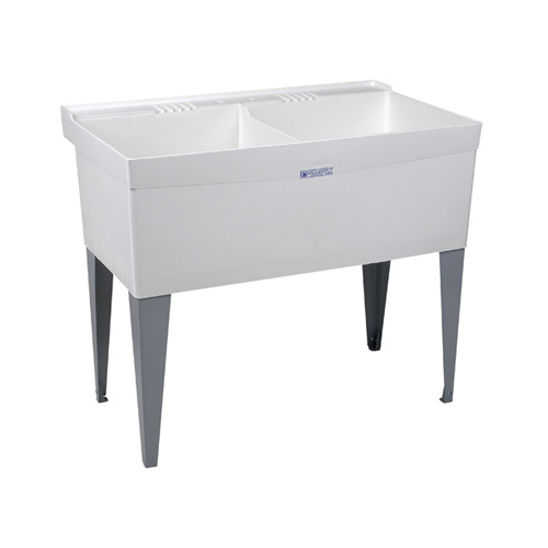 Sturdy, one-piece molded tub made with structural thermoplastic. Heavy gauge steel legs, included levelers and stopper. 13 in. deep, 19 gal. per tub, 40 in. wide. Leak proof 1-1/2 in. integral molded drain, hooks up to standard 1-1/2 in. S or P trap. Accommodates single or dual handle faucet with 4 in. or 8 in. centers. Meets or exceeds codes ANSI Z124.6, IAPMO listed, Warnock Hersey listed. Smooth white surface, rust-resistant, easy-to-install. Preferred by the pros.