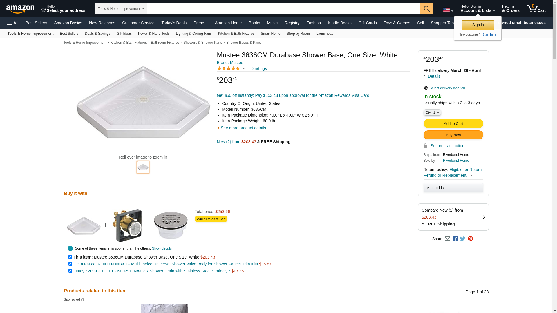 Mustee 3636CM Durabase Shower Base, One Size, White