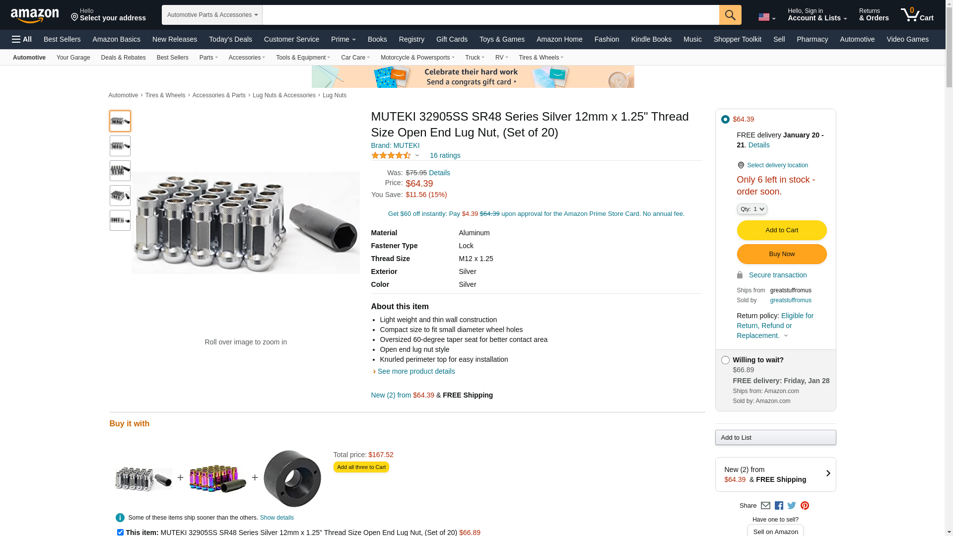 Muteki 32905SS SR48 Series Silver 12mm x 1.25" Thread Size Open End Lug Nut, (Set of 20)
