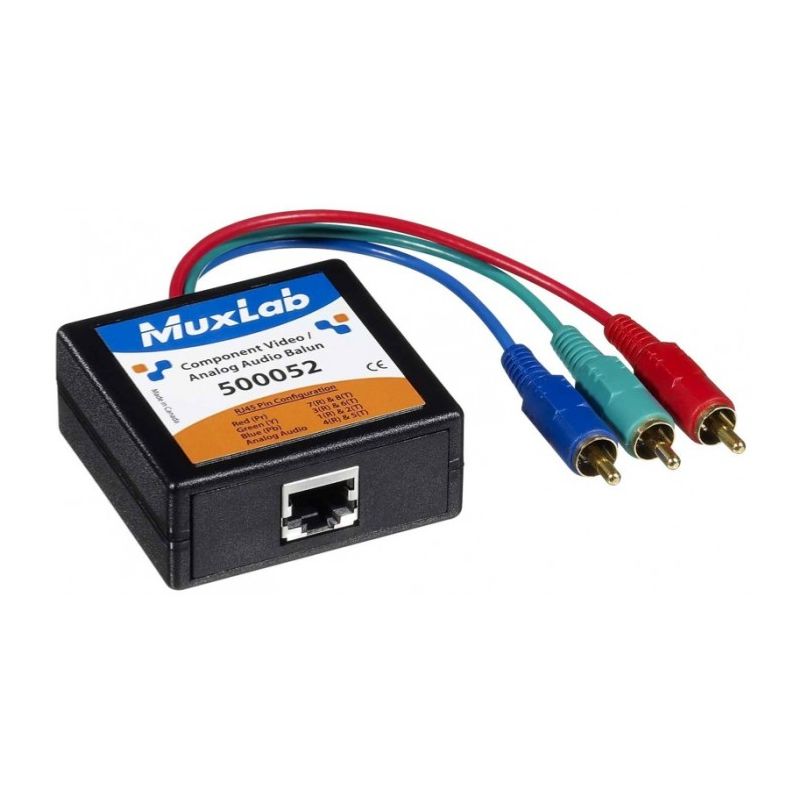 The Component Video/Analog Audio Balun 500052, 500053 allows one component video YPbPr or RGB signal and one Analog Audio signal to be transmitted via one Category 5E/6 twisted pair cable for more cost efficient cabling. Used in pairs, the Component Video/Analog Audio Balun supports 480i/p, 720p and 1080i/p video formats for commercial and residential hi definition HDTV video applications. Supports 480i/p, 720p, 1080i/p Supports 480i/p up to 1,000 ft 305m via Cat5E/6 Supports 720p/1080i/p up to 500 ft 152m via Cat5E/6 Molded color coded RCA cable leads Supports analog audio on fourth twisted pair Modular shielded RJ45 connector Benefits More cost efficient cabling Quicker moves, adds and changes Neater wiring
