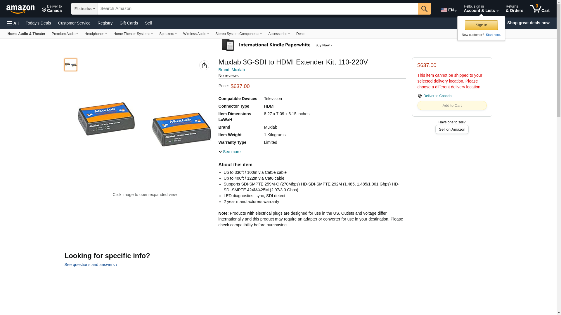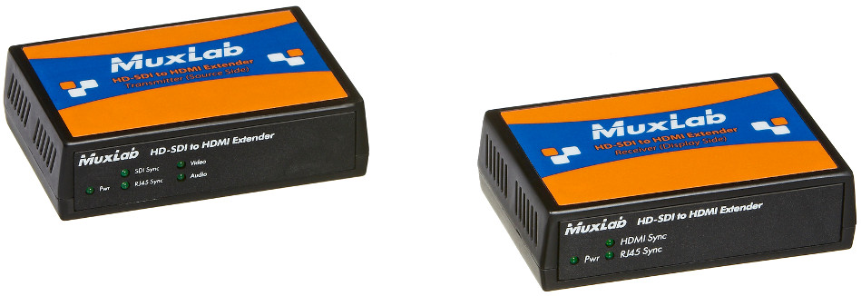 HDSDI to HDMI Converter CAT5 Extender Kit The MuxLab 500715 3GSDI to HDMI Extender Kit converts 3GSDI to HDMI and then transmits it up to 330 ft 100m via single Cat5e6 cable at all resolutions in a pointtopoint configuration The 3GSDI to HDMI Extender Kit supports transmission of up to 29730 Gbps uncompressed unencrypted digital video optionally including embedded Audio andor Time Code within television facilities and between professional video equipment Features. Up to 330ft 100m via Cat5e cable. Up to 400ft 122m via Cat6 cableSpecifications. LED Diagnostics Sync SDI detect. Environment SDI single link SD HD 3G. Weight 4 lbs