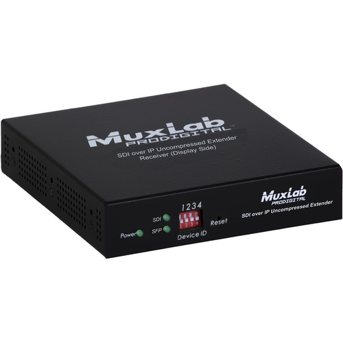 The Muxlab 500767 3G-SDI/ST2110 over IP Uncompressed Gateway Converter allows HD-SDI and 3G-SDI equipment to be extended up to 100ft (30m) via UTP Cat 5e/6 cable or up to 1300ft (400m) via duplex multimode OM4 fiber with LC connectors, at up to 1080p resolution @ 60Hz uncompressed, in a point-to-point configuration. Point-to-multipoint and multipoint-to-multipoint configurations are also possible by connecting several units to a 10G Ethernet network. The unit provides a 1G Ethernet Switch port to connect additional network devices, and an RS232 port for remote control of end devices. The 3G-SDI/ST2110 over IP Uncompressed Gateway Converter supports SMPTE ST-2110. The MuxLab Pro Digital Network Controller (500811) is available to simplify centralized configuration and control, software updates, and allows for management from the MuxLab Control smartphone and tablet App, and third party control Apps.