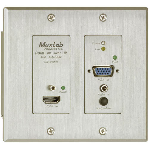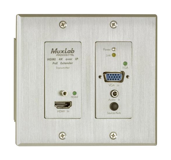 The HDMI/VGA over IP PoE Wall Plate Transmitter, UHD-4K is a two-gang wall plate transmitter which provides a convenient interface for HDMI and VGA input sources. It allows HDMI and VGA equipment to be extended up to 330ft (100m) from an Ethernet Switch via one (1) Cat5e/6 cable. The unit supports one (1) HDMI-In, one (1) VGA-In and one 2CH Audio-In, and supports resolutions up to 4K (3840×2160) @ 30Hz for HDMI and 1920×1200 @ 60Hz for VGA. The input selection between HDMI and VGA inputs may be locally or remotely selected, and supports auto and manual switching modes with LED indicators. This device may be used with the MuxLab 500758-RX and 500759-RX over IP Receivers, all managed via the 500811 Network Controller. The device supports PoE (PD) for easy installation.