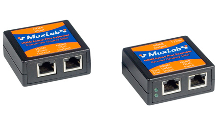 The MuxLab HDMI Econo Plus Extender Kit (500401) allows HDMI equipment to be connected up to 150 ft (45m) via two (2) Cat5e unshielded twisted pair cables in a point-to-point configuration at 1080p resolution. The product also supports 1080p Deep Color up to 90 ft (27m) via Cat6 cable.</p>