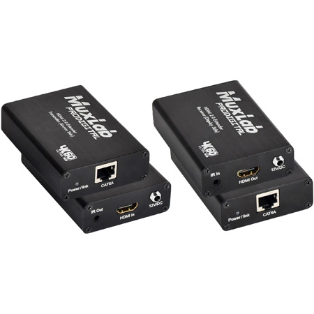 The Muxlab <b>500409</b> HDMI 2.0 Extender Kit allows HDMI equipment supporting uncompressed video up to 4K/60 (4:4:4) resolutions to be connected over Cat6a/7 unshielded twisted pair cable in a point-to-point configuration at distances up to 30m at 4K/60, 40m at 4K/30 and 45m at 1080p. The unit supports HDCP 2.2, and audio pass-through up to Dolby Atmos & DTS:X. The HDMI 2.0 Extender Kit supports a 1-way IR port (carrier wave) for remote control of end devices. The kit comes with one (1) Transmitter and one (1) Receiver as well as an IR Emitter and IR Sensor for remote control application.</p><p>This kit supports PoC, allowing the Transmitter to power the Receiver, or the Receiver to power the Transmitter. Connect the 12VDC power supply to either the Receiver or Transmitter first, and then plug the power supply into an AC power outlet.</p><p><b><ins>Applications</b></ins>:<br />Applications include commercial and residential AV systems, classroom projector systems, digital signage, boardroom systems, collaborative PC systems, and medical information systems.</p>