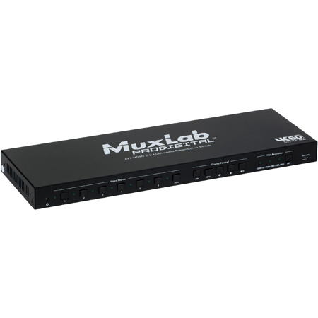 The Muxlab <b>500445</b> 6x1 2.0 Multimedia Presentation Switch is a compact scaler switcher with 6 video inputs (3x HDMI, 1x DisplayPort 1.2a, 1x USB Type-C, and 1x VGA) that supports up to 4K/60 (4:4:4) video resolution @ 8 bits and 1080p/60 3D. The unit supports HDCP 2.2, HDR 10, smart EDID management, and a 2CH Analog Audio extract port, plus 5.1CH Digital Audio extract. The device will pass-through audio signals up to Dolby Atmos and DTS:X. In addition, two of the HDMI ports support MHL for smartphone & tablet connectivity.</p><p>The 6x1 HDMI 2.0 Multimedia Presentation Switch scales & switches any video signal to the HDMI output. The inputs may be switched under user control, either locally via push buttons and remotely via IP, RS232 and IR remote control, or it may be controlled automatically via "Auto" mode.</p><p>The unit offers CEC control for remote management of end devices.</p><p><b>Note</b>: HDMI cables not included.</p><p><b><ins>Applications</b></ins>:<br />Computer Environments<br />Monitoring<br />Conference Room And Conference Centers<br />Corporate Boardrooms<br />Hotels And Hospitality Rooms<br />Big Screen Displays<br />Education<br />Command/Control Centres And Smart Homes.</p>
