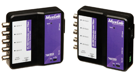 The 6G-SDI Extender over Fiber Optic is a unique solution from MuxLab for extending SDI cameras or other SDI sources in up to 4K resolutions to a distance of up to 985ft (300m) using OM3 fiber, 1300ft (400m) using OM4 fiber, 33,000ft (10km) using single mode fiber - model 500732-SM10 and 132,000ft (40km) using single mode fiber - model 500732-SM40. This product allows versatile combinations of sources such as one 6G SDI source, two 3G-SDI sources or four HD-SDI sources.</p><p><strong>Applications:</strong><br />Video production, Broadcasting, Outside Broadcasting vehicle, HD camcorder, Studio-to-studio, Post production, Live events, Medical imaging display, Mobile video</p>
