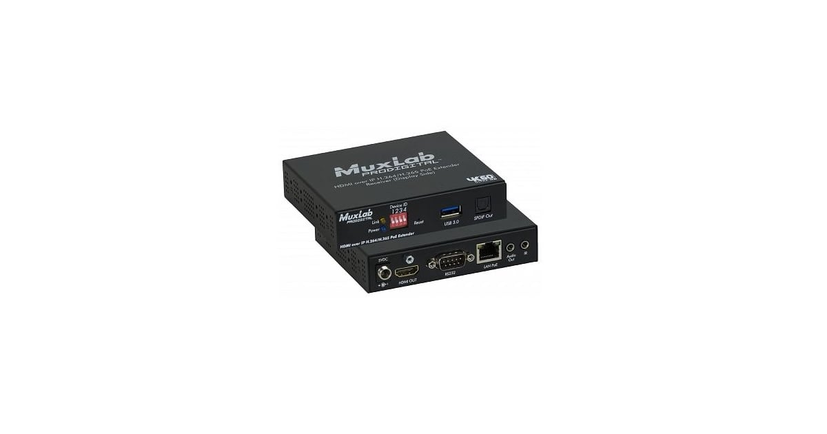 The Muxlab MUX-500762-RX HDMI over IP H.264/H.265 PoE receiver, when used in combination with the MUX-500762-TX ( transmitter, sold separately), allows HDMI source and display equipment to be extended locally up to 330ft (100m) at up to 4K @ 60Hz resolution via Cat5e/6 cable in point-to-point, point-to-multipoint and multipoint-to-multipoint configurations via a local Ethernet network, in a low bandwidth, flexible, expandable and cost effective manner, without the need to install dedicated cabling systems. The exceptionally low bandwidth requirements of this device combination allows for streaming audio/video content over a local network, over WiFi, and over the Internet for distributed installations spread-out throughout the globe. The transmitter accepts a 1080p @ 60Hz video and streams the content to the Receiver, where the signal is up-scaled up to 4K @ 60Hz to be displayed on a 4K monitor. The Receiver also accepts H.264/H.265 video streams from other transmitting devices of up to 4K @ 60Hz, and supports a USB 3.0 Type A connector for storing and playback of local content from an external USB drive. These devices support PoE (PD) and may be powered by a PoE (PSE) Ethernet Switch. Please note!This is the receiver only! Transmitter sold separately.