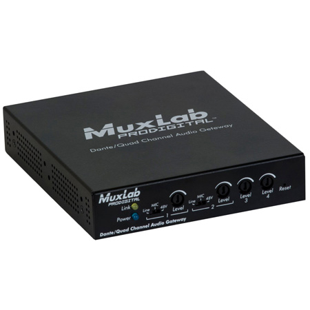 The Muxlab <strong>500765</strong> Dante/Quad Channel Audio PoE Gateway permits non-Dante compatible analog audio equipment to interface with Dante compatible professional audio equipment. The device supports PoE (PD) and may be powered by a PoE (PSE) Ethernet Switch.</p><p>The unit allows Dual two-channel or Quad single-channel full range (20Hz to 20KHz) balanced analog audio signals to be transmitted over the network to Dante compatible professional audio equipment. Dual two-channel or Quad single-channel balanced analog audio signals may also be received from Dante compatible equipment in the same manner. The unit may be connected via Cat5e/6 cable up to 330ft (100m) from an Ethernet Switch.</p><p>The Dante/Quad Channel Audio PoE Gateway includes four single-channel balanced analog audio-in and four single-channel balanced analog audio-out ports, via phoenix connectors. The Quad single-channel balanced analog audio-in ports may be connected to line level balanced analog audio signals or to line level balanced microphones. The Quad single-channel balanced analog audio-out ports may be connected to balanced analog audio amplifiers supporting line level inputs, such as the MuxLab 500217 Audio Zone Amplifier 100W, or to two pairs of powered speakers for direct sound output.</p>