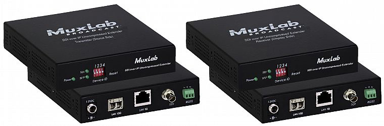 The Muxlab 500767 3GSDIST2110 over IP Uncompressed Gateway Converter allows HDSDI and 3GSDI equipment to be extended up to 100ft 30m via UTP Cat 5e6 cable or up to 1300ft 400m via duplex multimode OM4 fiber with LC connectors at up to 1080p resolution 60Hz uncompressed in a pointtopoint configuration Pointtomultipoint and multipointtomultipoint configurations are also possible by connecting several units to a 10G Ethernet network The unit provides a 1G Ethernet Switch port to connect additional network devices and an RS232 port for remote control of end devices The 3GSDIST2110 over IP Uncompressed Gateway Converter supports SMPTE ST2110 The MuxLab Pro Digital Network Controller 500811 to simplify centralized configuration and control software updates and allows for management from the MuxLab Control smartphone and tablet App and third party control Apps Features. Transmit Uncompressed SDI video up to 3GSDI 1080p 60Hz over a 10G Ethernet network. Supports the SMPTE ST2110 protocol. Extend up to 100ft 30m over Cat5e6 or 1300ft 400m over OM4 fiber. Supports 100s of Transmitters Receivers depending on network bandwidth. Supports pointtopoint pointtomultipoint and multipointtomultipoint applications. Supports a 1G Switch port for additional network devices. Supports RS232 for remote control of end devices. Managed via Pro Digital Network Controller 500811 MuxLab Control App via smartphones and tablets and 3rd Party control AppsSpecifications. Weight 4 lbs