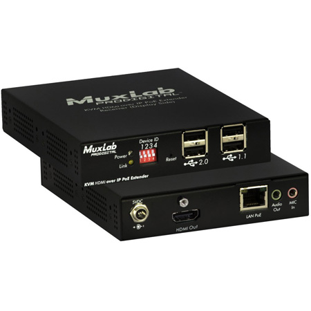 The Muxlab <b>500770-RX</b> USB KVM Extender over IP PoE allows HDMI & USB equipment to be connected up to 330ft (100m) over an Ethernet LAN, supporting 1920x1200 and 1080p resolution @ 60Hz via Cat5e/6 cable in multiple point-to-point and point-to-multipoint configurations. The Transmitter (500770-TX) and Receiver (500770-RX) support PoE (PD) if used with a PoE (PSE) Ethernet Switch.</p><p>The Transmitter terminates to a computer server/workstation via an HDMI & USB port, The Receiver terminates to an HDMI display and up to 4 USB devices such as a keyboard, mouse, printer, drawing pad, storage device, camera, etc., via a 4 port USB hub. A single Receiver can be switched via hotkey sequences to any Transmitter on the network, allowing a single operator to manage numerous servers/workstations, in a distributed KVM application.</p><p><strong><ins>Applications:</ins></strong><br />Management of multi-server systems supporting HDMI displays in IT departments within corporations<br />Educational institutions<br />CAD Design<br />Graphic Design<br />Media Servers<br />Data Centers</p><p><strong>IMPORTANT NOTE!</strong><br />A new firmware version 2.0 has been released, which includes important enhancements such as support for infrared Pronto codes, numerous bug fixes, improved system performance, and support for the new models including the 500778 & 500777-RX. Please see the Release Notes for further details.</p><p>Firmware version 2.0 or greater for this device will only operate correctly with compatible devices that are also running the same firmware version 2.0 or greater. If your existing installation includes compatible devices with older firmware versions, you have two options: Either upgrade all your existing compatible devices to firmware version 2.0 or greater. Or downgrade the new device to a firmware version lower than 2.0.</p><p>Firmware versions for your compatible devices are available at the following MuxLab website link: https://muxlab.com/support?section=software-and-firmware</p><p><strong>Compatible devices include the following TX and RX models:</strong> 500758, 500759, 500770, 500771, 500773, 500777, 500778.</p>