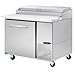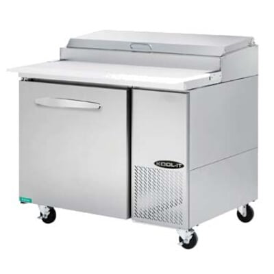 MVP Kool-It KPT-44-1 Improve your restaurant today with this nearly 45"" long Pizza Prep Table from Kool-It. With its raised pan rail and single door, one section refrigerated base, you will be able to store all of your raw ingredients and toppings, keeping you from running back and forth from a standalone fridge. The removable polyethylene cutting board and stainless steel interior and exterior allow for easy clean up every time, and its easy grip handle keeps your cooking process efficient.Dimensions: 42""H x 44.4""W x 36.6""D115V/60Hz/1-phase3/8 HP 6.5 ampsR-134-a refrigerant11.3 cu. ft. capacity(1) door(2) shelves(6) pans includedUL, ETL SanitationWarranty: 18 months parts and labor. Additional 42 months on compressor (part only)