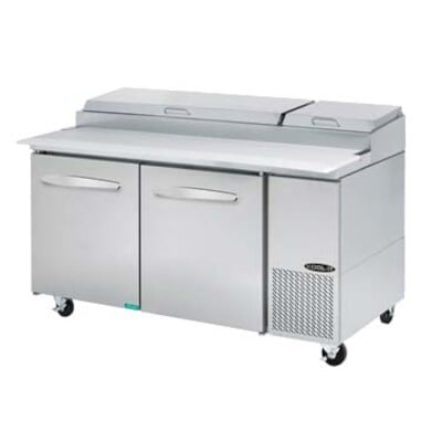 MVP Kool-It KPT-67-2 Improve your restaurant today with this nearly 67"" long Pizza Prep Table from Kool-It. With its raised pan rail and single door, one section refrigerated base, you will be able to store all of your raw ingredients and toppings, keeping you from running back and forth from a standalone fridge. The removable polyethylene cutting board and stainless steel interior and exterior allow for easy clean up every time, and its easy grip handle keeps your cooking process efficient.Dimensions: 42""H x 67""W x 36.6""D115V/60Hz/1-phase3/8 HP 6.5 ampsR-134-a refrigerant20.2 cu. ft. capacity(2) door(4) shelves(9) pans includedUL, ETL SanitationWarranty: 18 months parts and labor. Additional 42 months on compressor (part only)