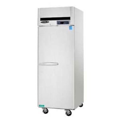 MVP Kool-It KTSR-1 This Kool-It Reach-in Refrigerator is a 1 door, one section unit with 23 cubic feet of capacity. With a digital temperature control, you can be sure that your refrigerator is staying at the temperature that you need it. The (3) shelves accommodate full-size bun sheet pans. The solid stainless steel door has an easy grip handle and key locks for security. It's stainless steel interior makes clean up easy. WIth a top mounted condensing unit, you wont have to worry about adding as much heat to your kitchen. Includes heavy duty 4"" casters with 2 front breaks to allow convenienent moving, whether you are rearranging or just cleaning.115v/60/1-ph, 1/3 HP, 5.0 amps, ETL / ETLSanitation