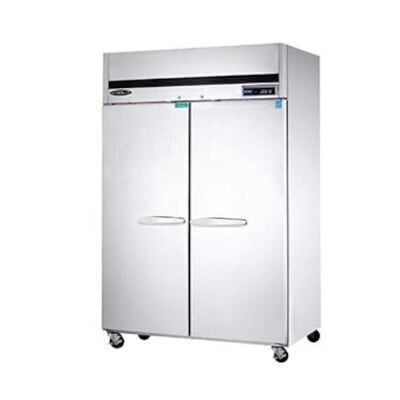 MVP Kool-It KTSR-2 This Kool-It Reach-in Refrigerator is a 2 door, two section unit with 49 cubic feet of capacity. With a digital temperature control, you can be sure that your refrigerator is staying at the temperature that you need it. The (6) shelves accommodate full-size bun sheet pans. The solid stainless steel doors have easy grip handles and key locks for security. It's stainless steel interior makes clean up easy. WIth a top mounted condensing unit, you wont have to worry about adding as much heat to your kitchen. Includes heavy duty 4"" casters with 2 front breaks to allow convenienent moving, whether you are rearranging or just cleaning.115v/60/1, 1/3 HP, 5.1 amps, ETL / ETLSanitation