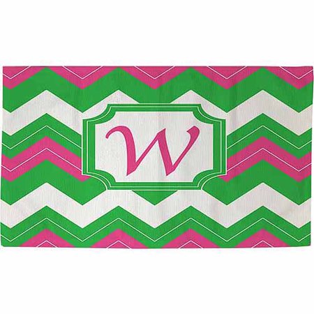 <br /> <b>Thumbprintz Chevron Monogram Rug, Fuchsia:</b> <ul> <li>Beautiful art by MWW Design Studio creates a monogram design in fuchsia, lime green and white for this printed woven rug</li> <li>The rug is woven, sewn and printed </li> <li>Made from 100 percent polyester, the rug is durable and has naturally weather resistant properties</li> <li>A textured weave design in the fabric adds dimension to the art</li> <li>Great for kitchen, bed and bath</li> <li>Machine wash, cold water, mild detergent, lay flat to dry</li> </ul>
