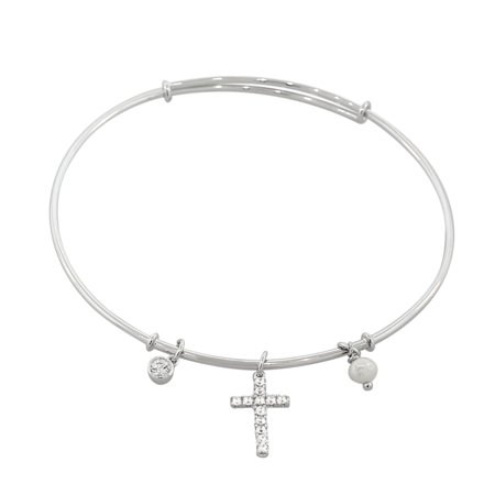 925 Sterling Silver Latin Cross Religious Simulated Pearl CZ Bangle Bracelet