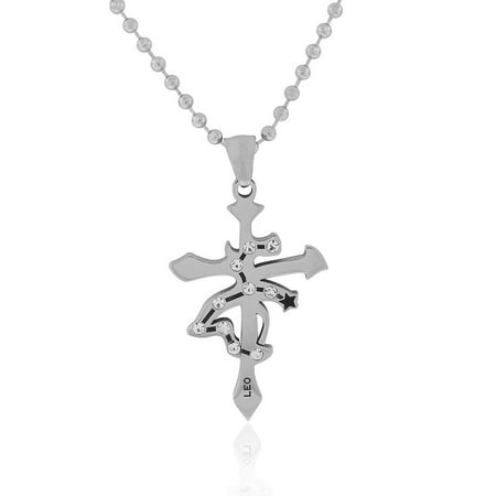 Stainless Steel Silver-Tone White CZ Zodiac Cross Pendant Necklace - Leo, 24"