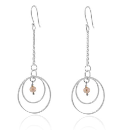925 Sterling Silver Pink Simulated Pearls Concentric Circles Long Dangle Earrings