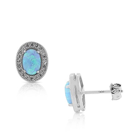 925 Sterling Silver White Clear CZ Simulated Blue Opal Oval Stud Earrings, 0.40"