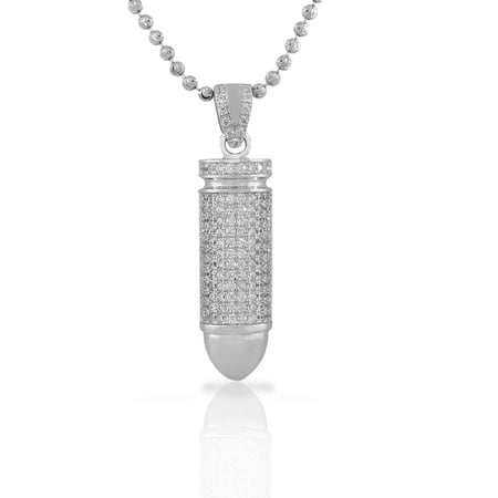 <p> Model No. ASL871 </p> <p> The sterling silver jewelry is a perfect gift for anyone. The pendant showcases an elegant design displaying a large solid bullet-shaped charm sparkling with beautiful white CZ stone accents. The necklace is crafted of sterling silver, rhodium plated. Get it for your loved one, or treat yourself for a classic timeless style. The shiny and durable sterling silver ball chain measures 30.00in long and locks with a lobster claw type of clasp for extra security. Look and feel great with this exquisite necklace! </p> <ul> <li> Material: .925 Sterling Silver </li> <li> Charm Dimensions: 1.70n x 0.45in </li> <li> Chain Dimensions: 30.00in x 0.08in </li> <li> Weight: 21.4 grams </li> </ul> <p><small> 925 Sterling Silver White CZ Large Solid Bullet Pendant Necklace with Chain </small></p>