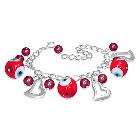 <p> Model No. AT0142 </p> <p> This Fashion Evil Eye Jewelry is Hot! Perfect gift for a lady. Give it to the loved one, or treat yourself for a trendy bracelet style. The evil eye design on this bracelet is a symbol believed to protect the wearer from bad luck. The bracelet features red beads and hearts charms; and an a lobster claw type of clasp to lock it securely around your wrist. Look and feel great with this designer bracelet! </p> <ul> <li> Material: Alloy </li> <li> Length: Approx. 9.00in </li> <li> Weight: 27.70 grams </li> <li> Origin: Imported </li> </ul> <p><small> Fashion Alloy Red Evil Eye Beads Ball Heart Love Charm Womens Bracelet </small></p>