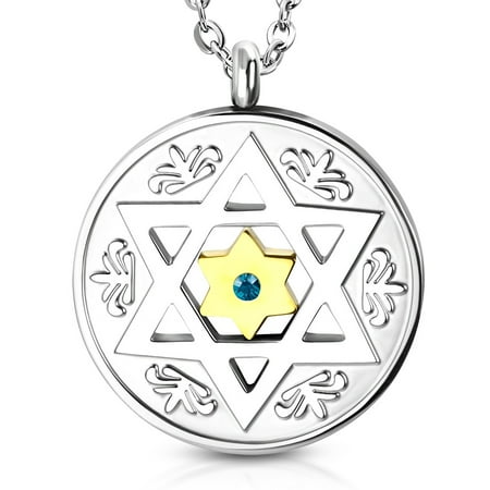Stainless Steel Two-Tone Blue CZ Jewish Star of David Round Men's Pendant Necklace, 22"