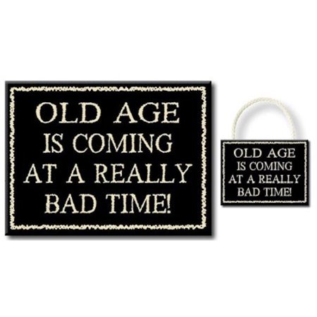 Old age is coming at a really bad time! This 4.5" x 6" hand silk-screened wood sign features a brightly colored rope hanger for easy display on your wall to add extra personality to your decor. Varnished for indoor use. Made in the USA.