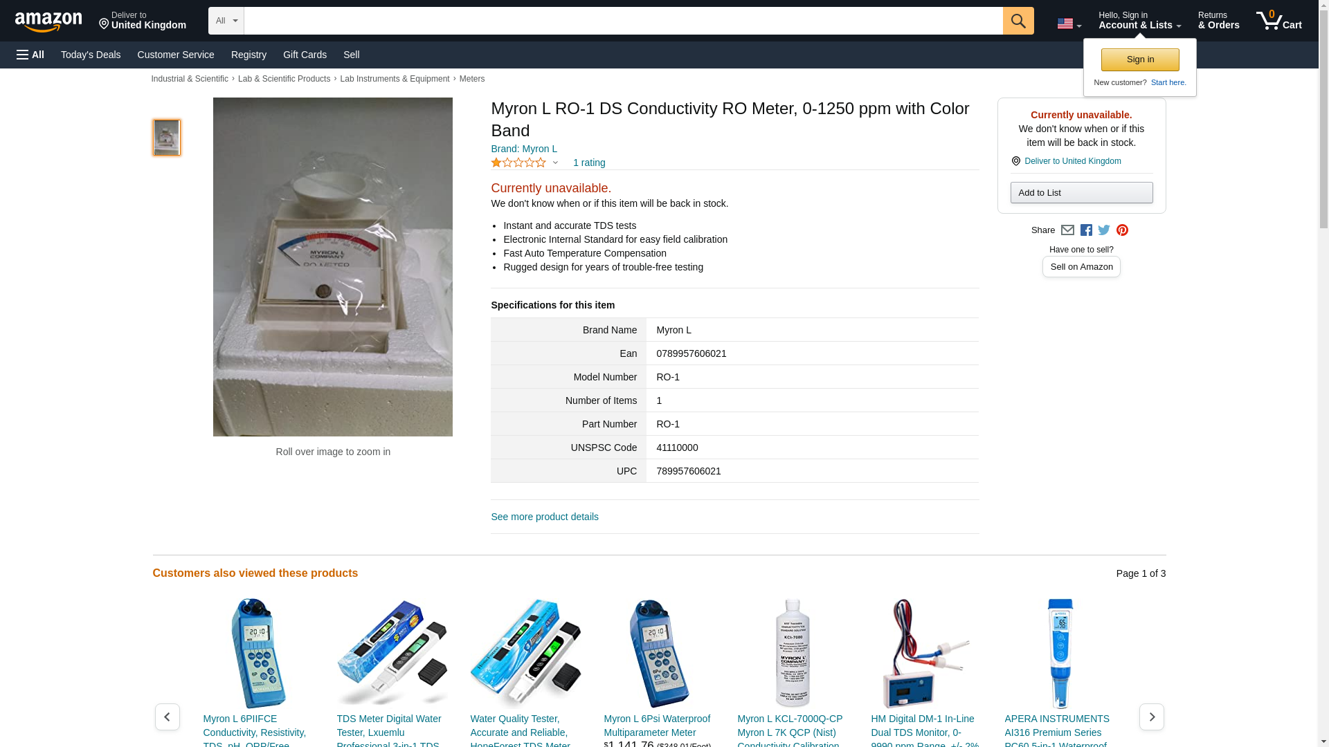 Myron L RO-1 DS Conductivity RO Meter, 0-1250 ppm with Color Band